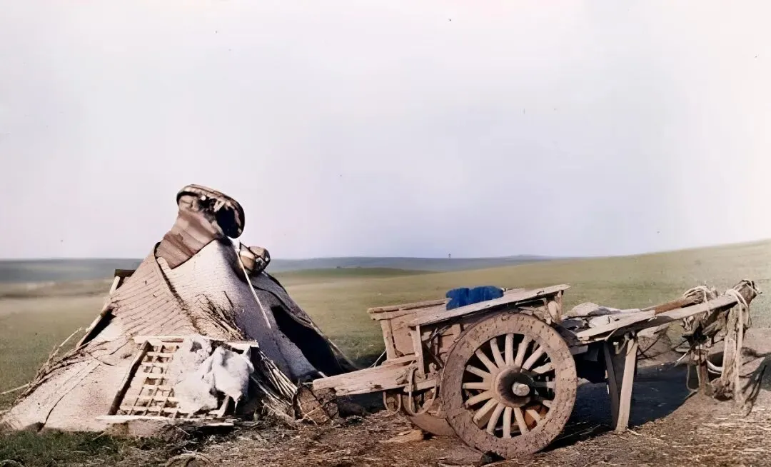这个场景有点心酸,倒了的毡包一身风沙,旁边木轮车辐条粗壮,铁皮还包在外缘,爷爷说这种车拉得多,换胎得用火烤着敲,手一不稳就烫得跳脚。