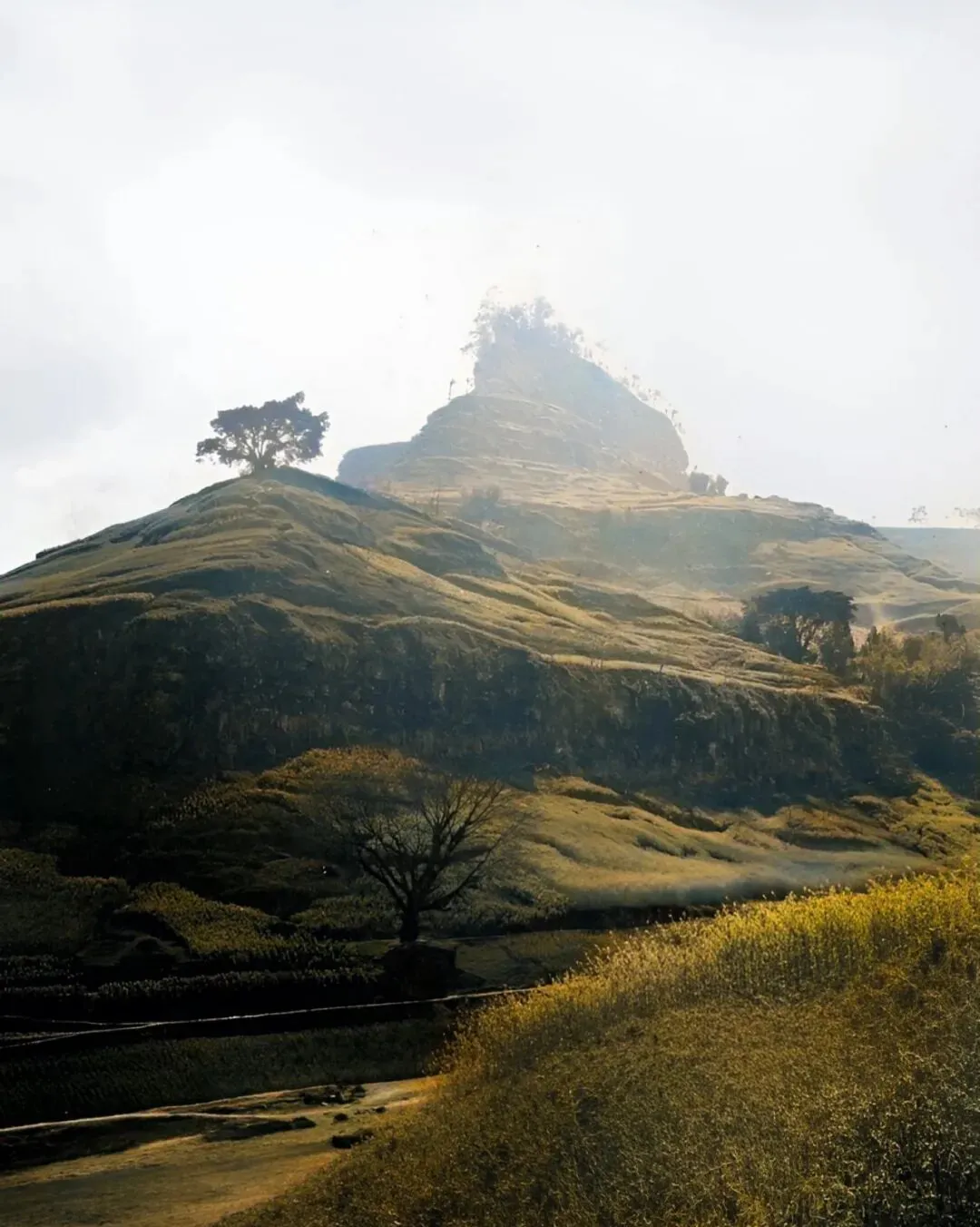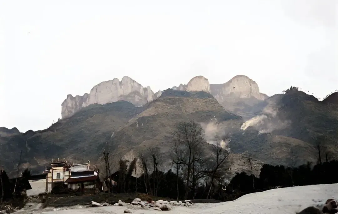 这排峭壁的线条像刀裁过,烟气在半山腰散开,山下屋舍错落,灶口的白烟细细往上爬,谁家在煮早饭呢,现在民宿窗子更大,落地玻璃直接把这片云气装屋里了。