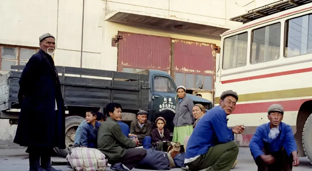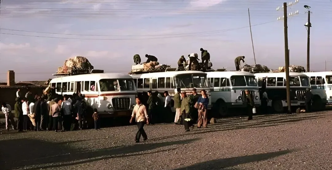 图中这群人正候车,背篓、包袱、搪瓷脸盆一字排开,男人蹲着抽烟,女人抱着孩子靠在车门边,车身上漆着“旅客运输”的字样,风一吹满是尘土味,听见售票员一喊开车,大家唰地站起来可利索了。