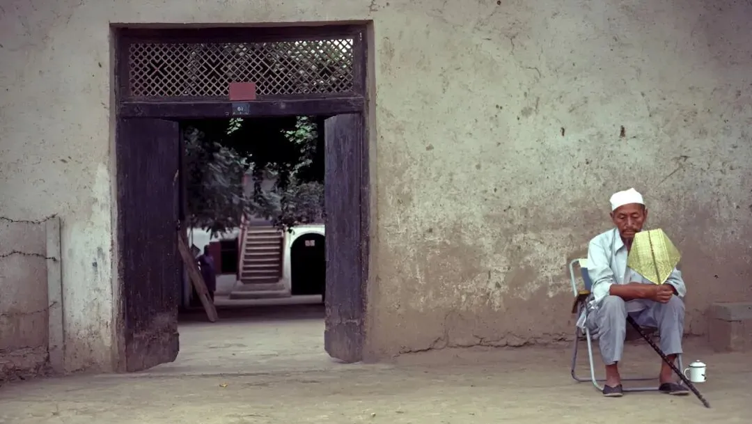 这两个老大爷坐在门前乘凉,一个拄着黑色弯把拐,一个眯眼笑着抚着胡子,土墙上裂缝纵横,像年轮一样把岁月刻在那儿了。