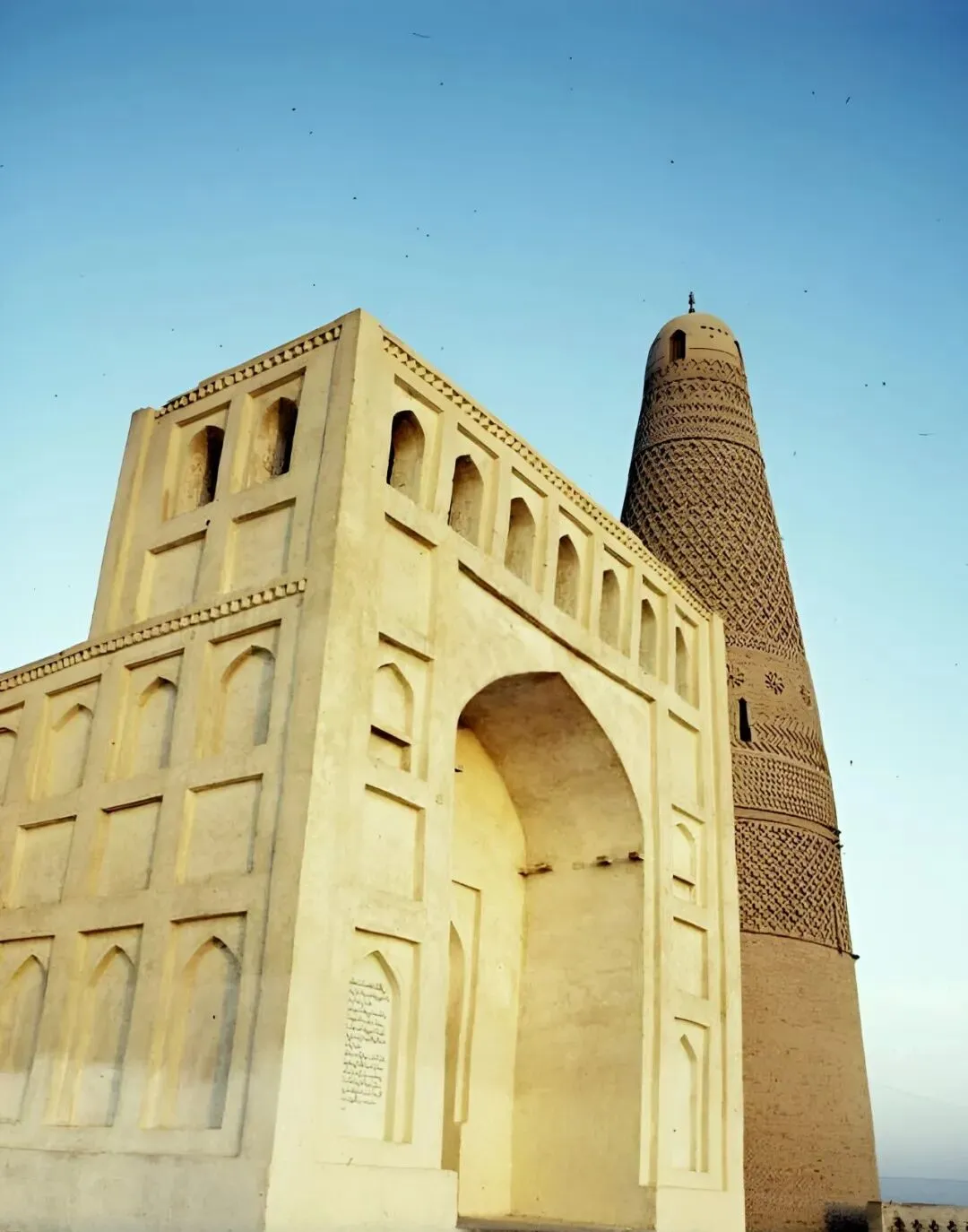 图中这座高挑的塔叫苏公塔,黄褐色夯土一样的颜色,身上嵌着细密的菱纹和几圈腰线,远远看像一只倒立的葫芦,晴空底下特别醒目,小时候我第一次见它还是在课本插图里,只记得老师说一句,爬到塔根处抬头看,天像被塔尖戳了个小洞。