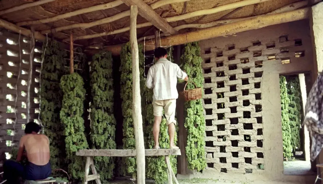 这个叫葡萄干晾房,土墙上留满了透风的小孔,屋梁下吊着成串的青穗,木凳子上一站,手腕一抖,细绳就把一挂挂葡萄给捆住了,静静等阳光和时间把甜味收紧。