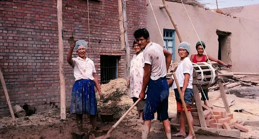 这是个建筑工地,几个人抡着木锹搅泥,一旁的木制绞盘咯吱咯吱转,滑轮把砖料吊上去,女孩的裙子上溅了泥点,笑着冲镜头挥手,说今天得把墙再起一层。