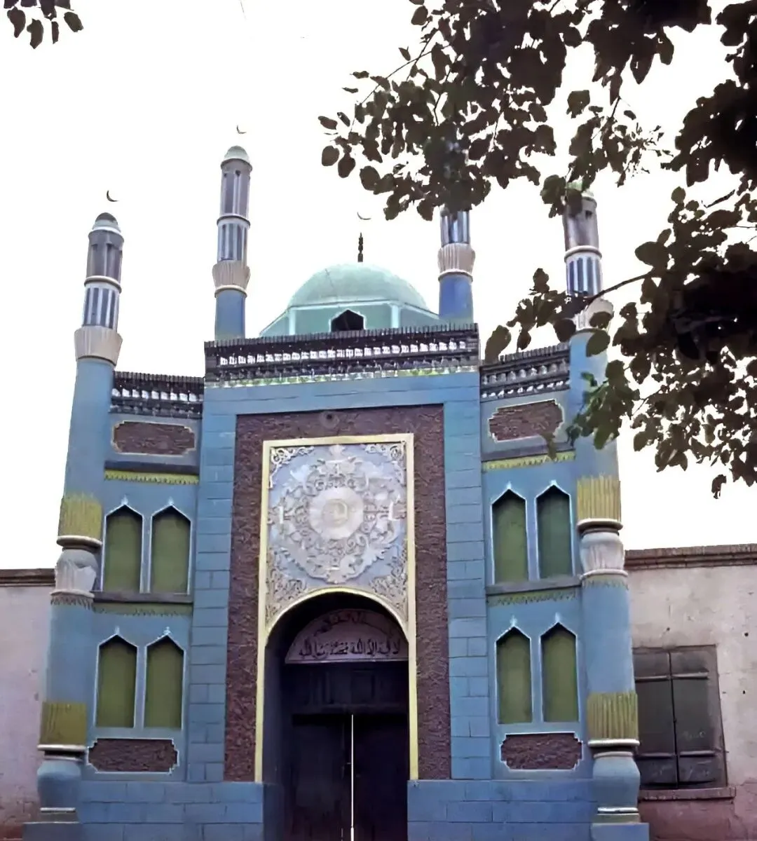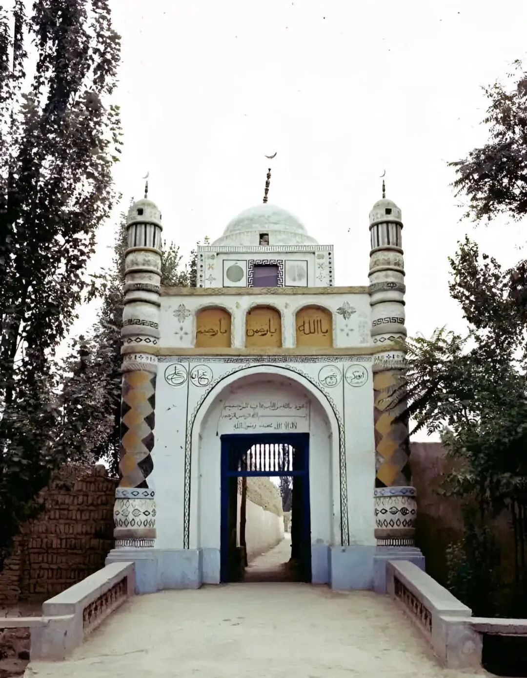 这个白色穹顶的清真寺门楼,左右各立一根细塔,小月牙在天光里泛着冷光,门楣上手写体的字一行行,进门得先把脚步放轻,心也会跟着静下来。