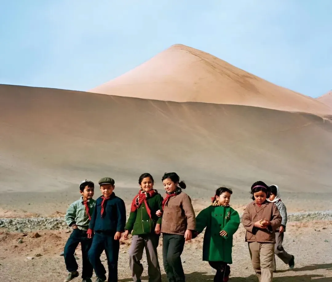 这群戴红领巾的孩子从沙丘边跑过,背景一面赤红的坡,光秃秃的见不着草,风一吹沙子就抹到嘴里,以前春游老师总说别离队,现在带队都是巴士直达了。