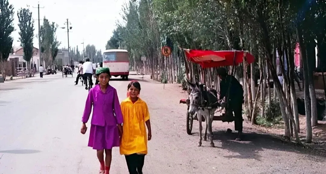 看最后这一张,林荫大道笔直,驴车停在树荫里歇气,两个小女孩穿着紫色和黄色的裙子手拉着手走来,远处一辆老巴士缓缓驶过,以前的吐鲁番这么漂亮,现在再去看,城更新了,人情味一点没少。