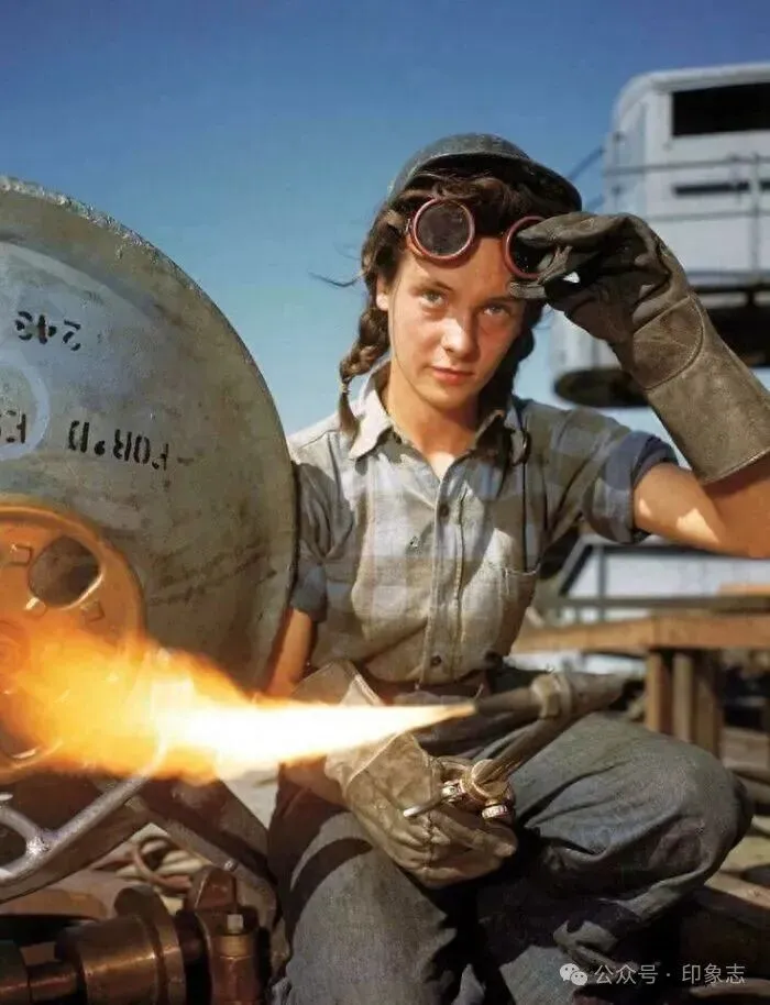 大约 1943 年,伯纳德·霍夫曼在康涅狄格州拍摄的一位年轻的女焊工。