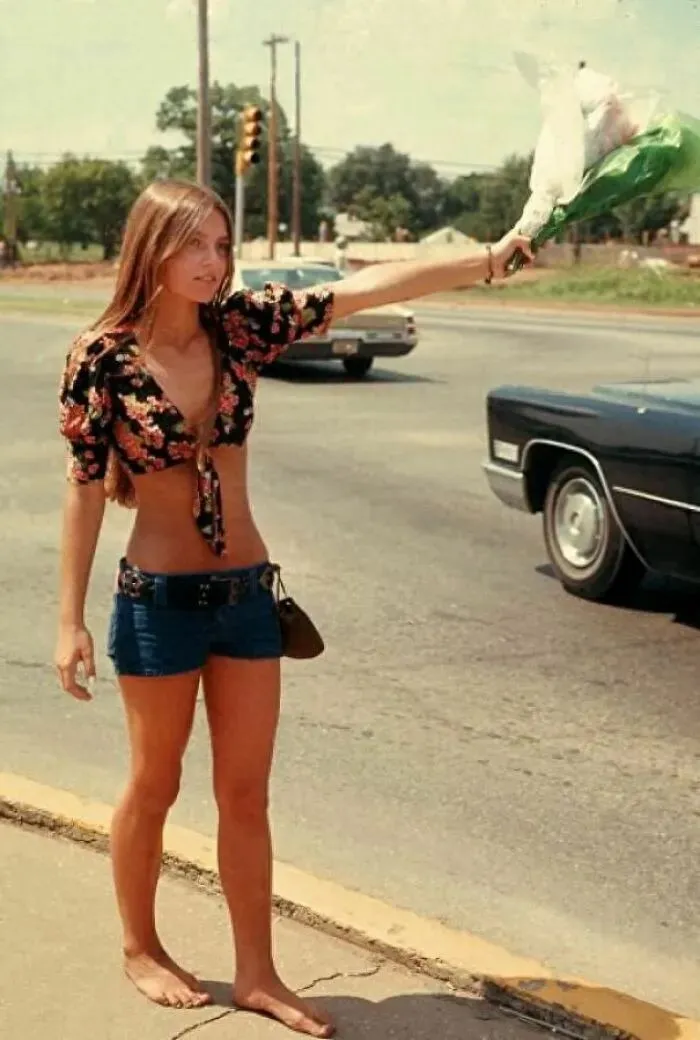 1973 年,俄克拉荷马州卖路边鲜花的嬉皮女孩