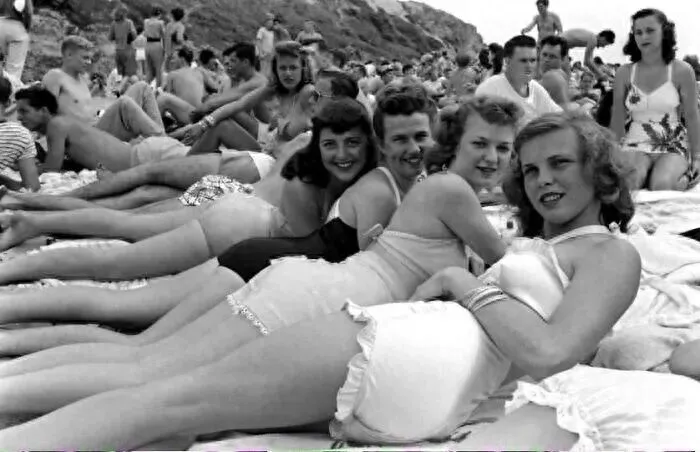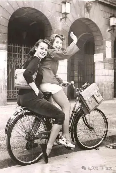 这些女学生骑自行车回家换衣服,因为学校禁止穿紧身裤。(西柏林,1953 年)