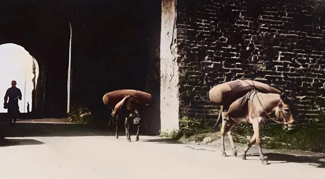 这个场面叫驮运,毛驴背上压着大箩筐,脚步稳,叮当声在城砖上回响,赶车人一句吆喝就过门洞了,小时候我跟在后头学人喊,嗓门小,回声倒是大。
