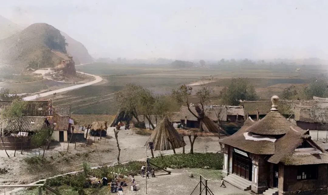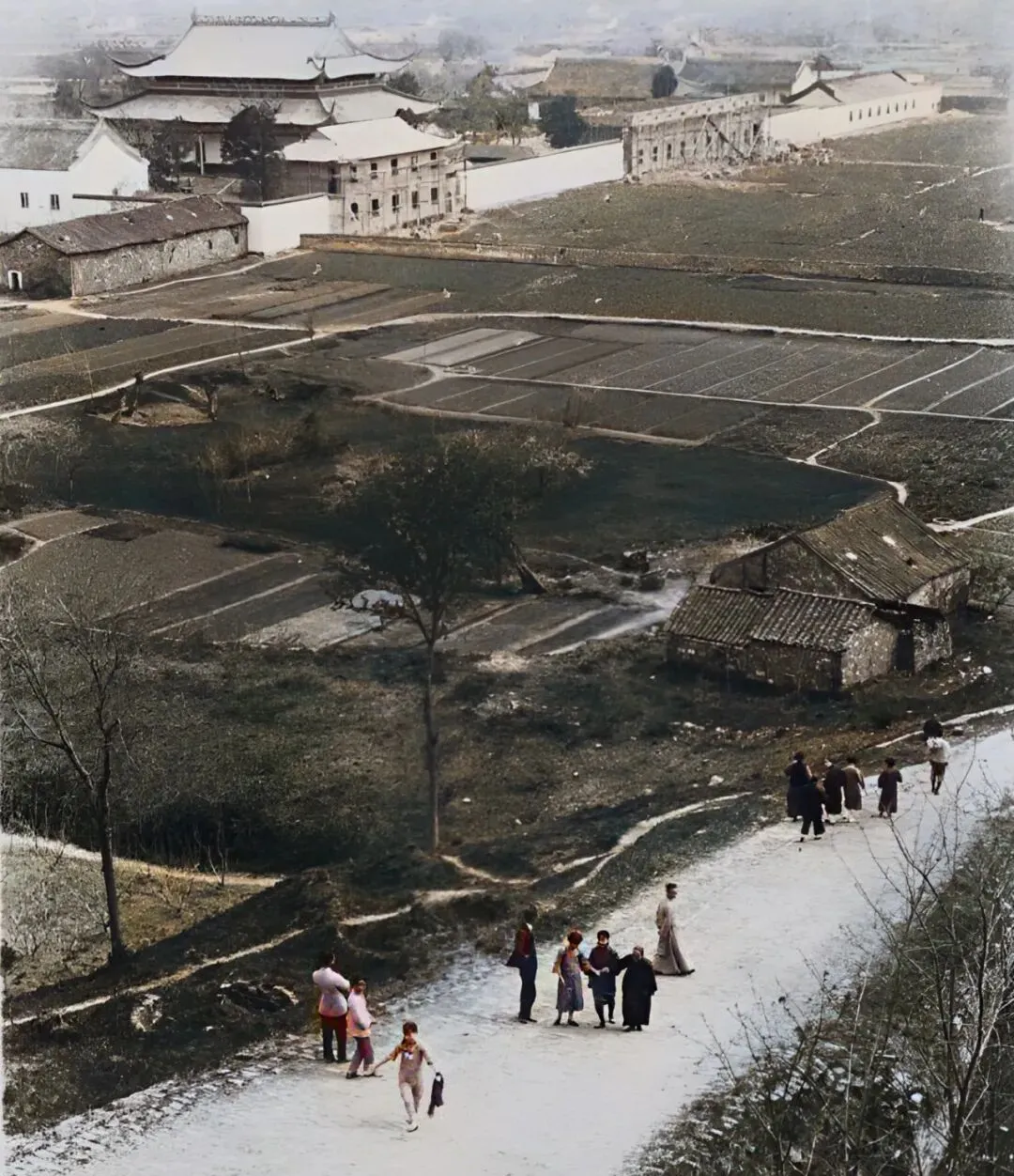 这张是从城墙上往下望,田畦一块块像棋盘,宫殿屋面舒展,行人沿着白道子慢慢走,衣摆在脚踝边扫来扫去,风里有土气,也有香火味。