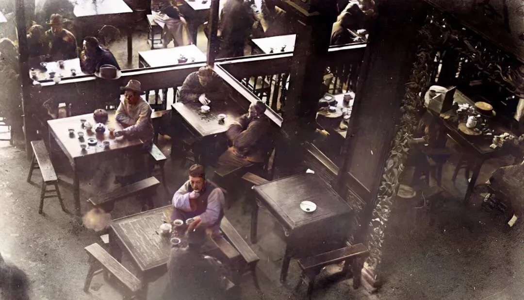 这间屋里摆的叫四方茶桌,盖碗叠在盏托上,桌面起了毛刺,掌柜端着铜壶绕来绕去,爷爷说早上坐一坐,能听到半座城的新闻。