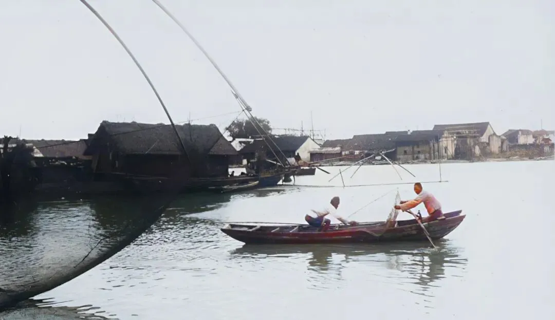 这张大弓似的玩意儿是抄网,两个汉子在小船上配合着收,篙子一撩,鱼就泼剌剌跳起来,岸边屋檐很低,像把人往水上推,我站在堤上看半天,不嫌腥气。