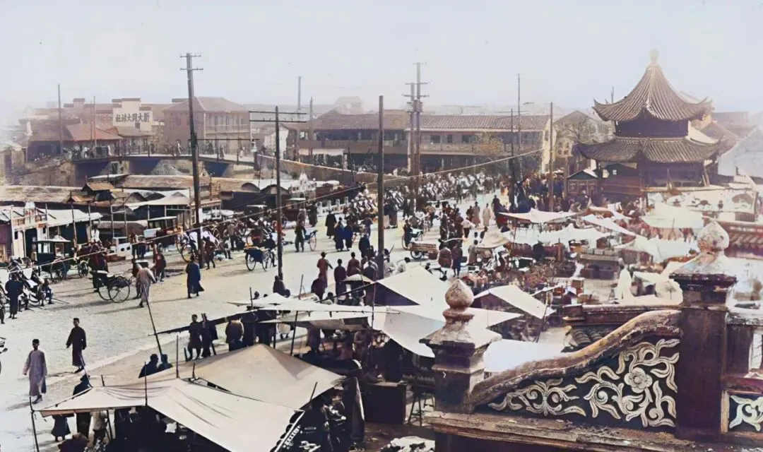 这个高处往下看,一地的伞篷撑开,叫卖声和算盘声混在一起,远处一队队人流顺街摆动,像江水起了涌,午后太阳狠,摊主把水盏往阴影里挪了挪。