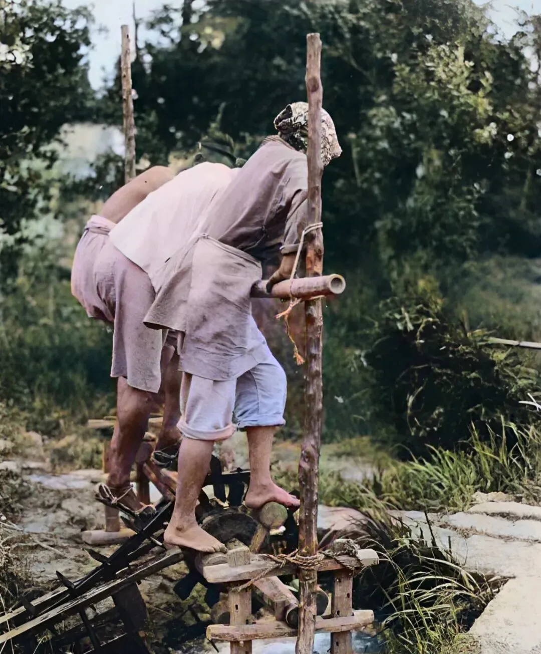 这个踏得咯吱响的叫人力水车,三个人一前一后踩着圆木,手上攀着横杆,一脚重一脚轻,水就一级级往上翻,外公说靠这个把秧田喂饱了水,天虽然狠,庄稼可不敢渴。
