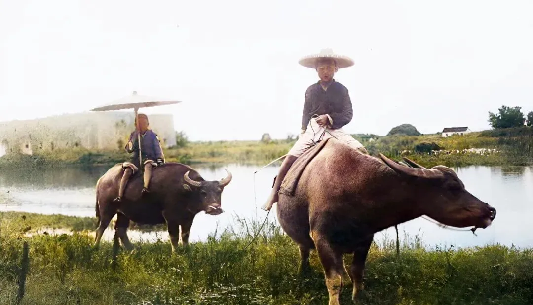 这个场景不用多说,骑在牛背上的两个孩子,一个撑伞一个挽袖子,牛耳朵一扇一扇的,草尖上挂着水珠,细雨里边不冷不热,野渡无人舟自横的味道就这么出来了。