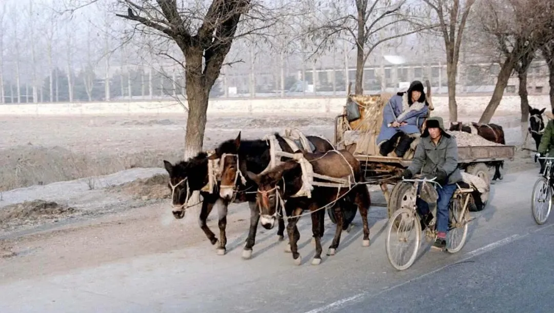 图里这叫毛驴车,前头套着革带和木拐,车板上铺着草垫,赶车的大爷用棉帽子压着耳朵,嘴里呵气一团白雾,旁边小伙子骑自行车伴着走,赶集拉麦子都靠它,跑一百里,一袋草料就能搞定。