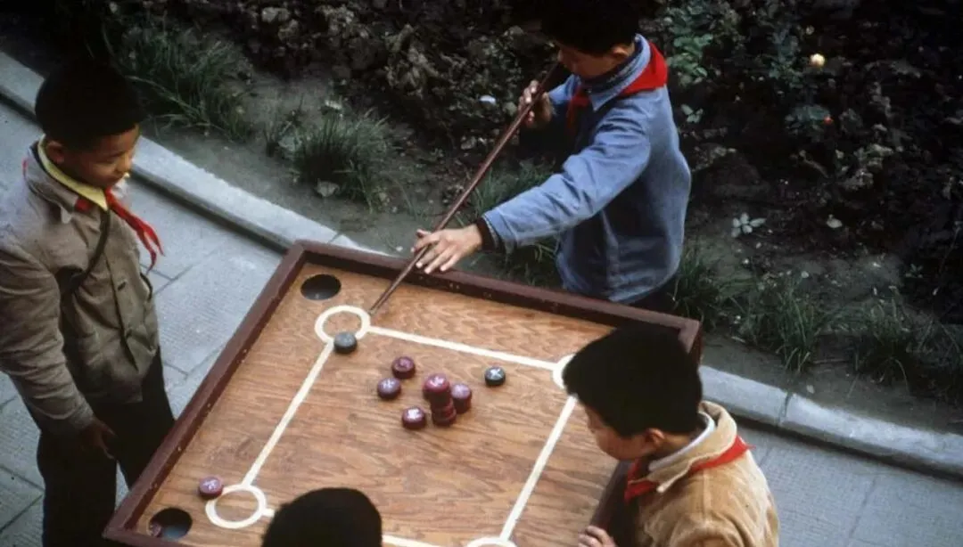 这张小桌游戏我们那儿叫四角,桌面是木纹,四个洞开在角上,孩子们用细杆一戳,棋子咕噜噜进洞,叮当一声脆亮,课后就围在路边,赢了把粉笔头插兜里当战利品。