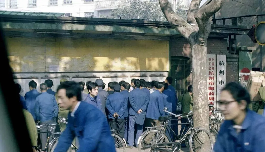 这个长墙叫阅报栏,玻璃后面压着当日要闻,大家双手背在身后往前探,谁读到一句新词儿就转头教给旁边的人,信息来得慢,可一传十十传百,不耽误事。