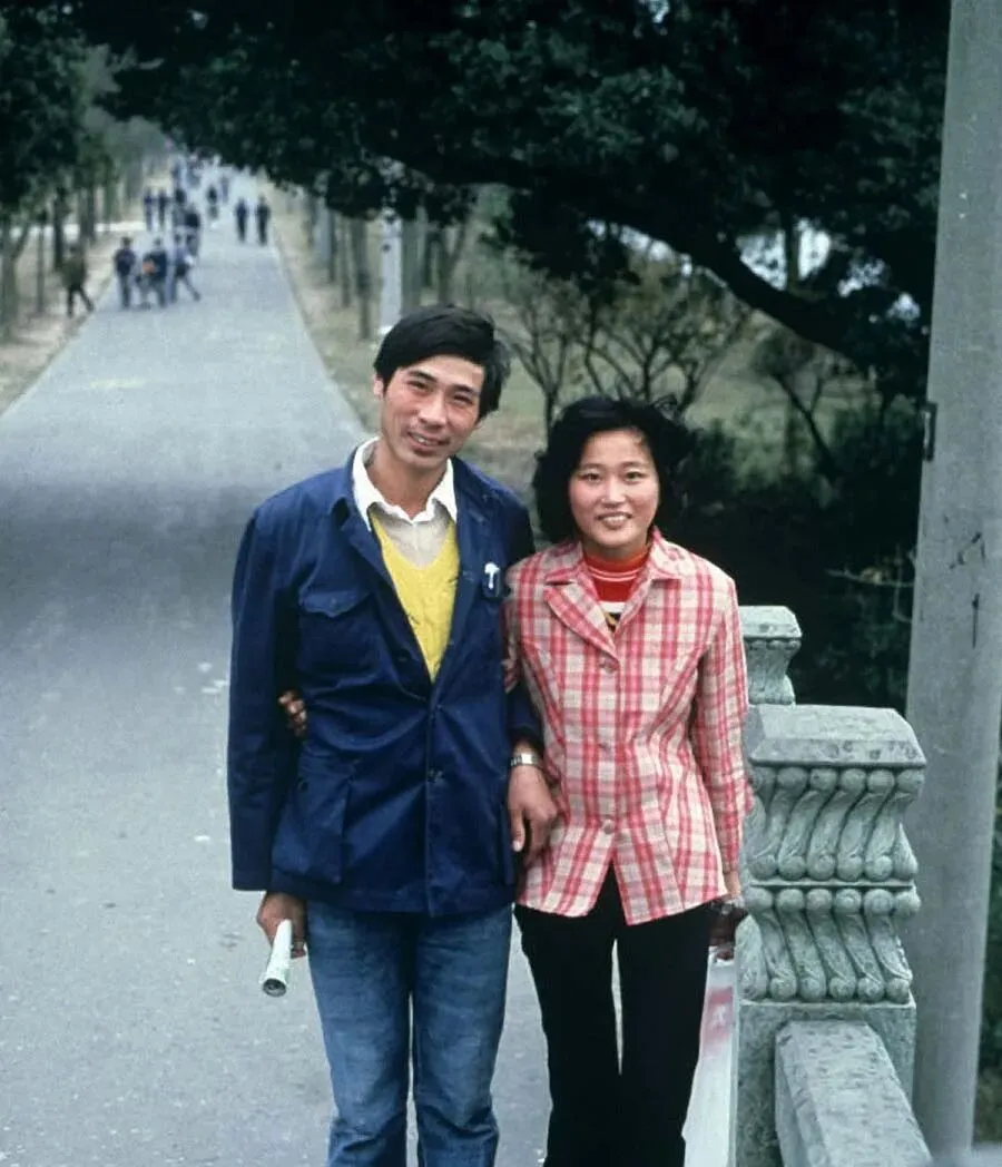 这俩人挽着胳膊站桥头,男的蓝外套口袋鼓鼓,女的格子衣服腰身收得利索,手里提着白瓷保温瓶,摄影师喊别动,他立马站直,她却忍不住笑,照片里那点羞涩是真好看。