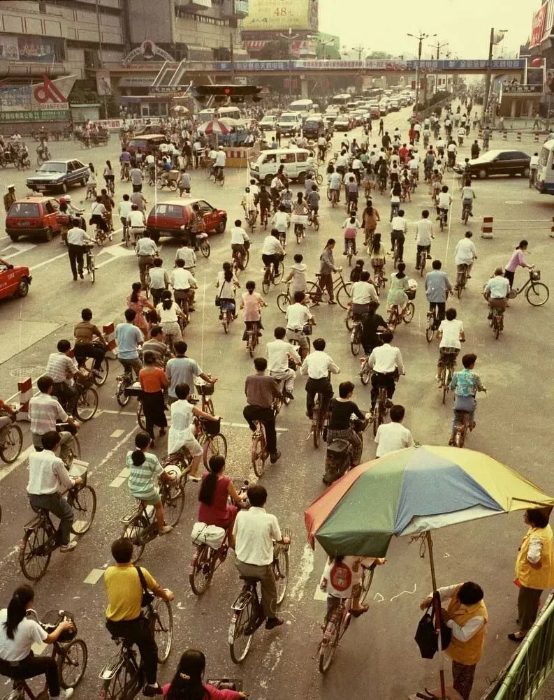 这处路口像锅开了,单车方阵一队队涌进,路边小伞底下有人卖冷饮,红绿灯一变,车铃齐响,那会儿拥堵也有节奏,现在车多了路也宽了,大家却更着急。