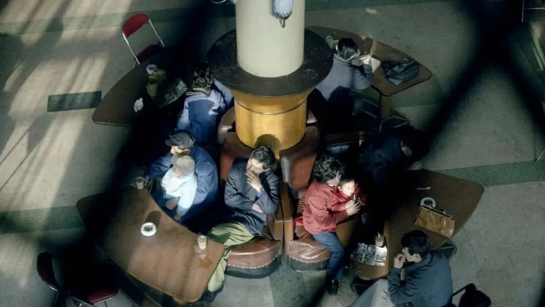 这组靠柱的圆桌老好认,木纹磨得发亮,杯子里漂着茶梗和瓷盖,孩子靠在妈妈怀里睡着了,广播一响,人群跟着起身,收好饭盒,提起包裹,车来了就走。