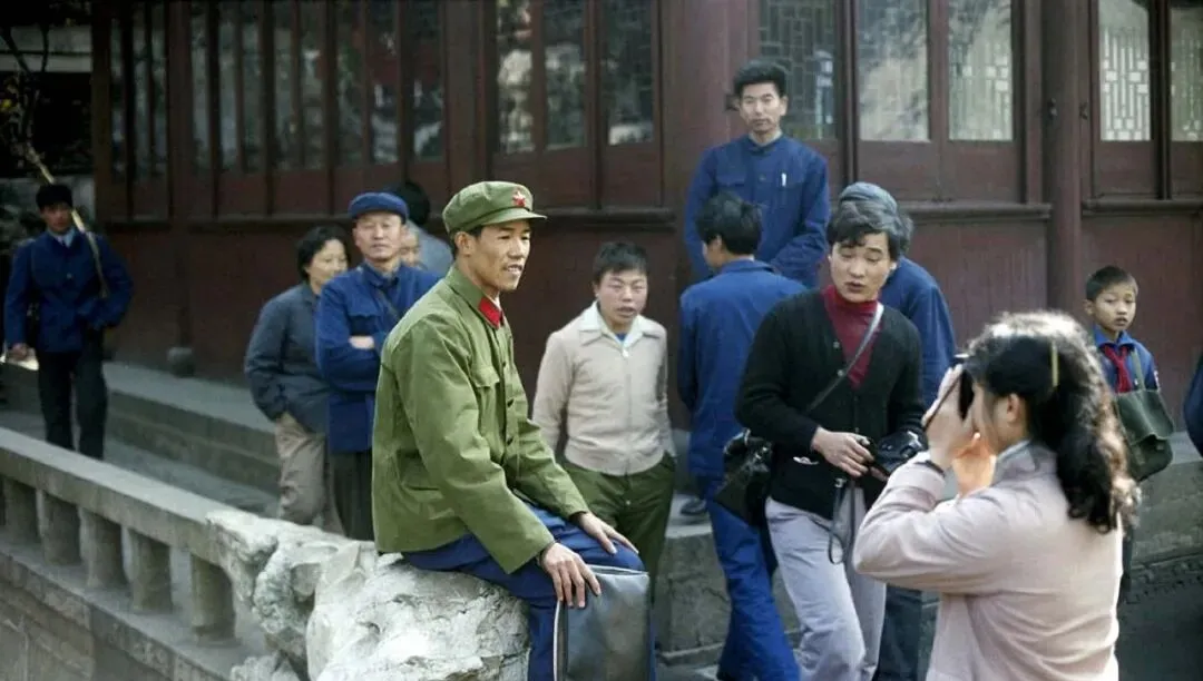 这个穿绿装的兵坐在石栏上,旁边排着照相机包,女游客凑过来对焦,他微微一笑,让她多拍一张,等寄回部队宿舍,兄弟们能围着乐半天。