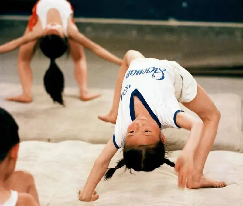 海绵垫又厚又旧,绒面磨得发白,教练拍着手数一二三,小姑娘咬牙一拱,后背撑起个漂亮的桥形,那股子憋红脸的认真劲,现在想起来都服气。