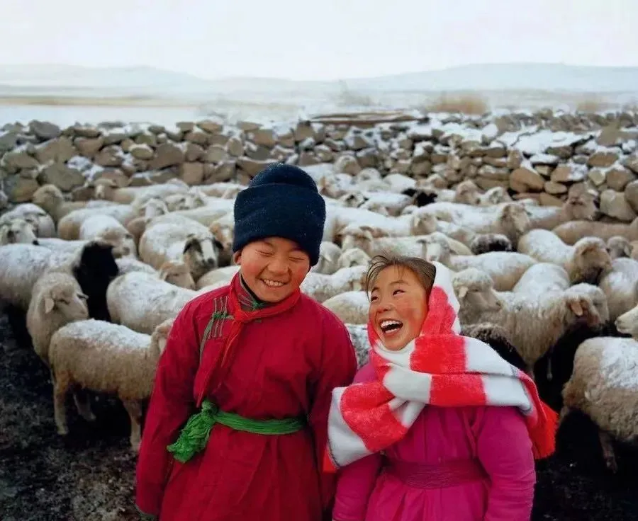厚棉袄颜色正,围巾一圈一圈裹得严实,哈气成雾,小伙伴笑得眼都眯没了,羊背上压着薄薄的霜,脚下咯吱咯吱的声儿,冷并快乐着。