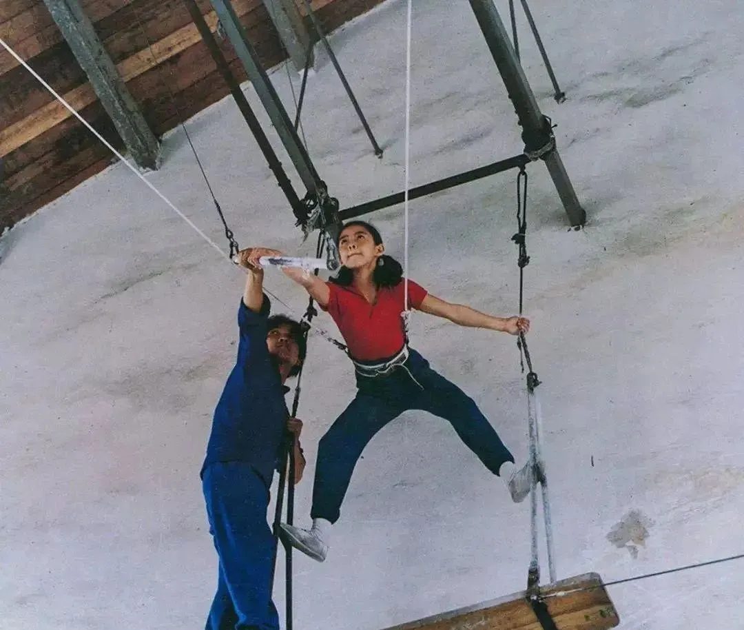 这个训练装置绳扣环环相连,手心一抓就捏出汗,教练伸手递过横杠,小姑娘一咬牙跨过去,下来时腿有点抖,还是乐得不行。