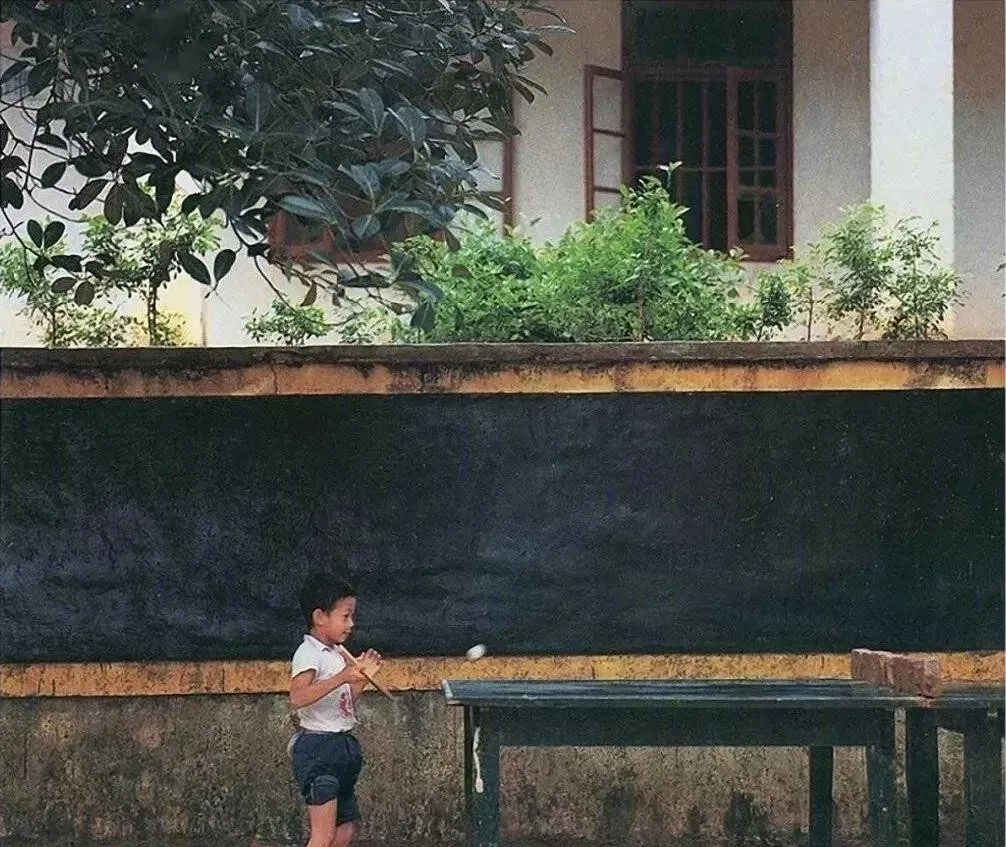 这张桌子边角掉漆,用砖头垫一角凑合着打,球拍木柄起刺,抹点粉笔就不打滑,发个转球把对面骗得直跺脚。