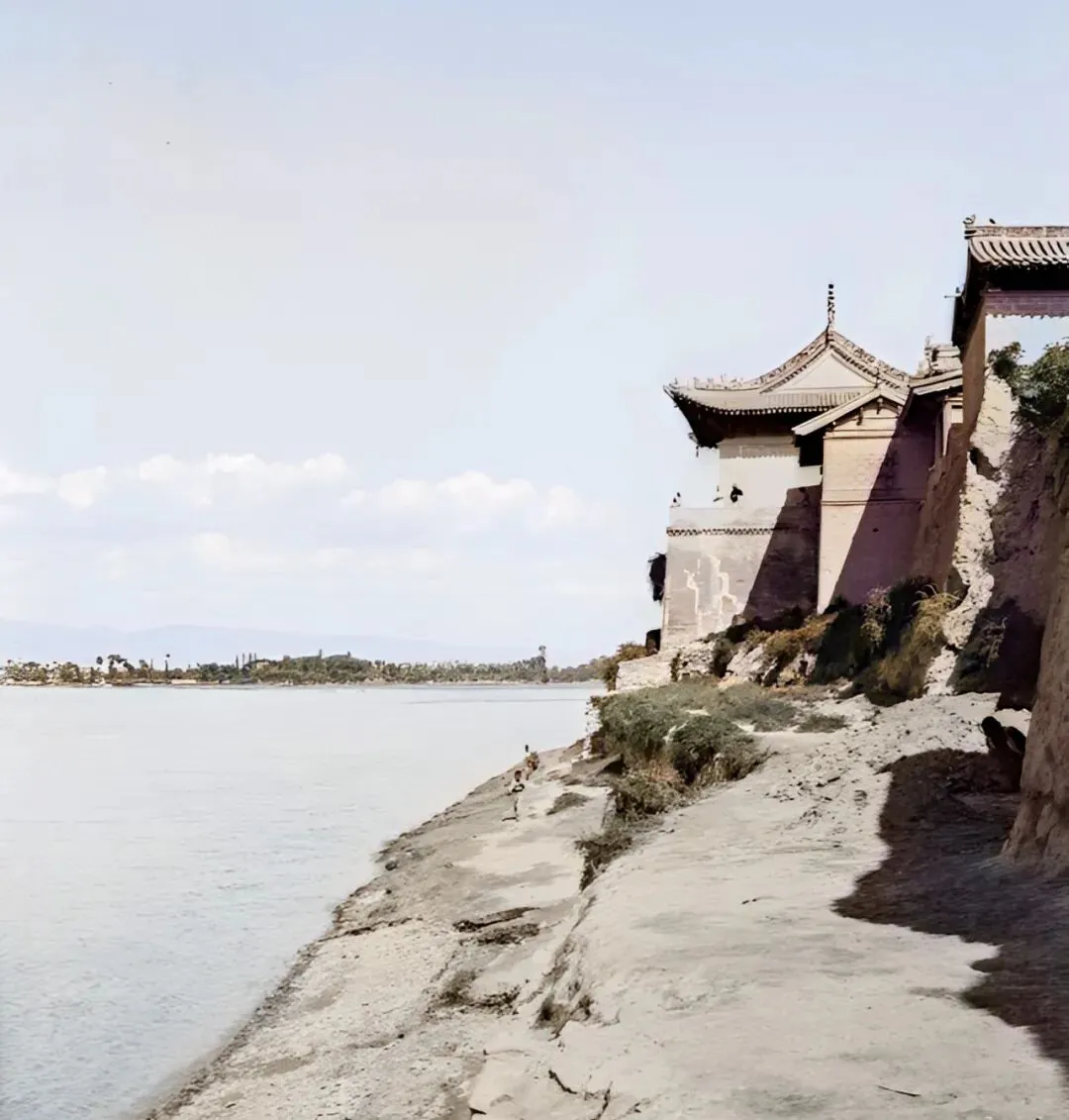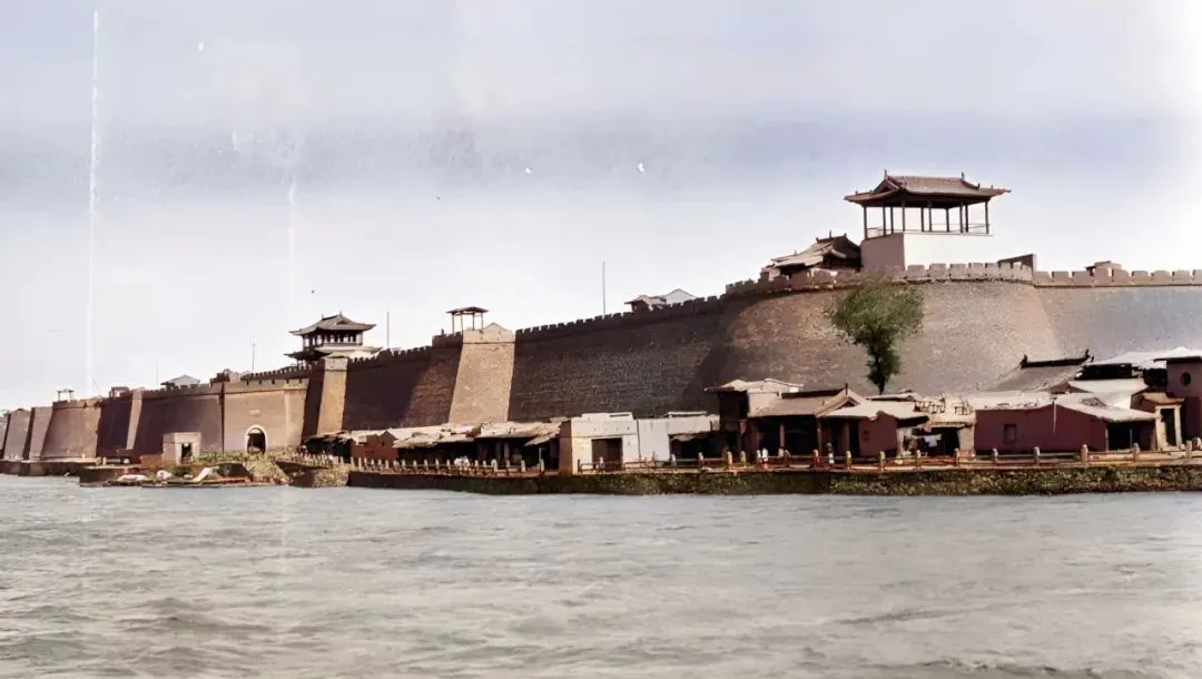 图中这面临河的城墙叫外城墙,墙体是黄灰色夯土里夹砖包边,女儿墙上开着垛口,台基高,箭楼挑着飞檐,风一吹檐角铃铛叮当响,城根下挨着一排小作坊,小屋泥墙木檩,门口堆着麻袋和木料,黄河贴着脚面流过去,城像一只伏在岸边的大兽。