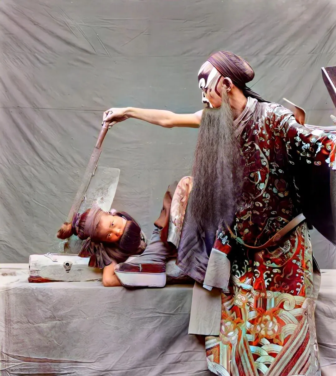 这张摆拍的戏班子照,长髯一甩,虎头铡抡得呼呼作响,脸谱一红一白,衣料是重缎子,亮得扎眼,我小时候跟着外公看过秦腔,他总说,台上铡得狠,台下才叫痛快,现在剧场灯光一打,声场是更好了,可那股子抖擞的堂会味儿,真不多见了。