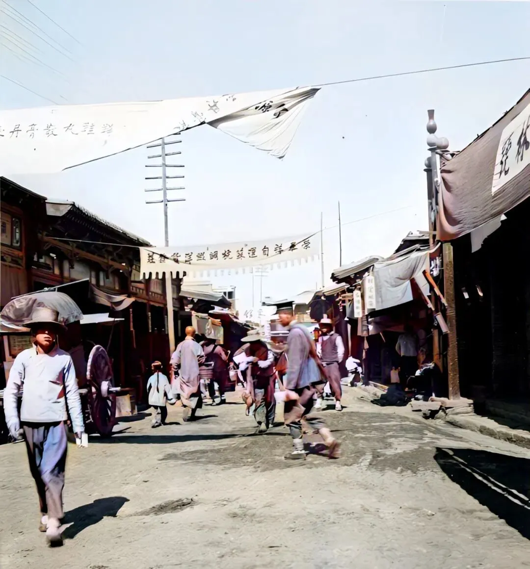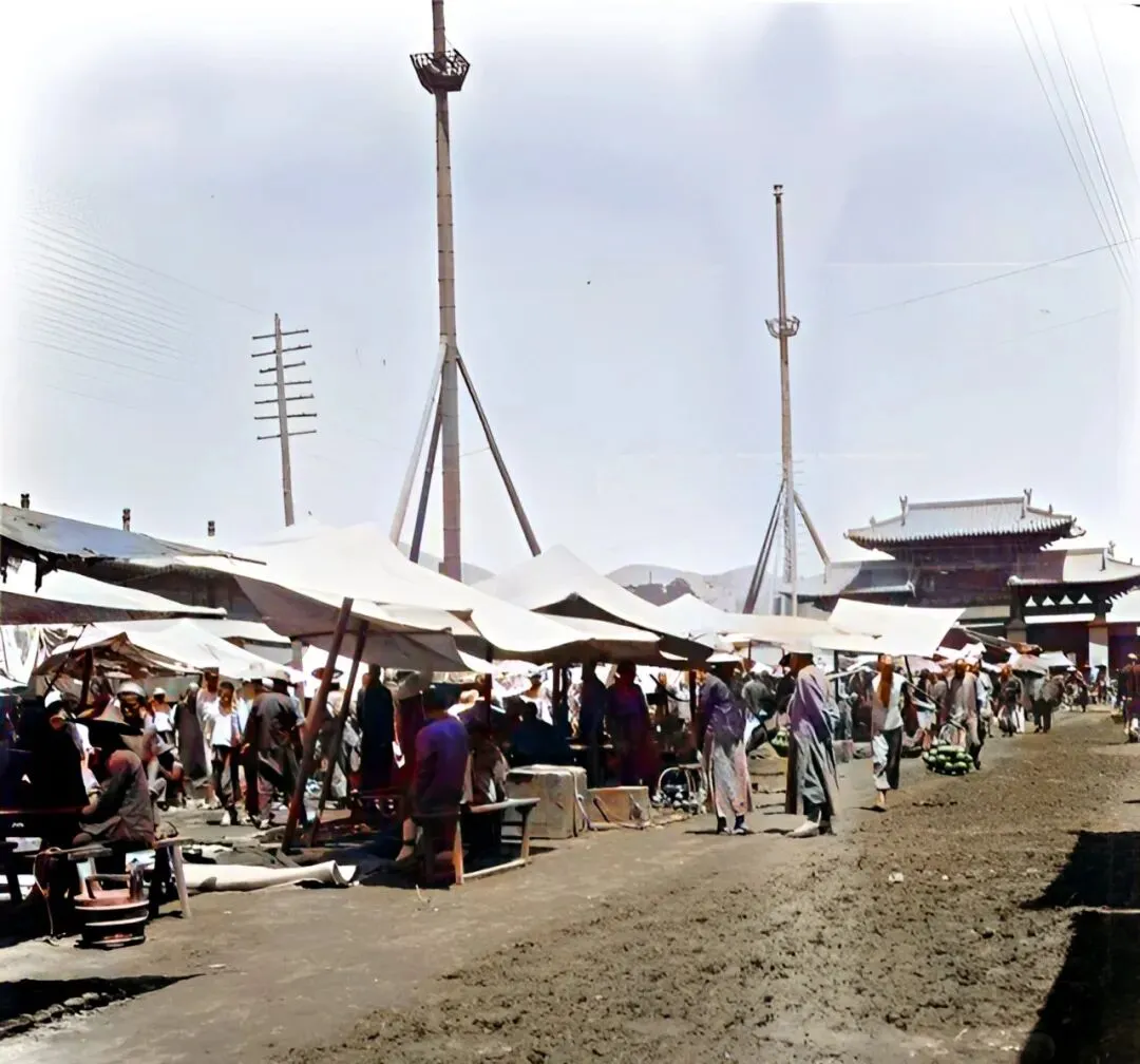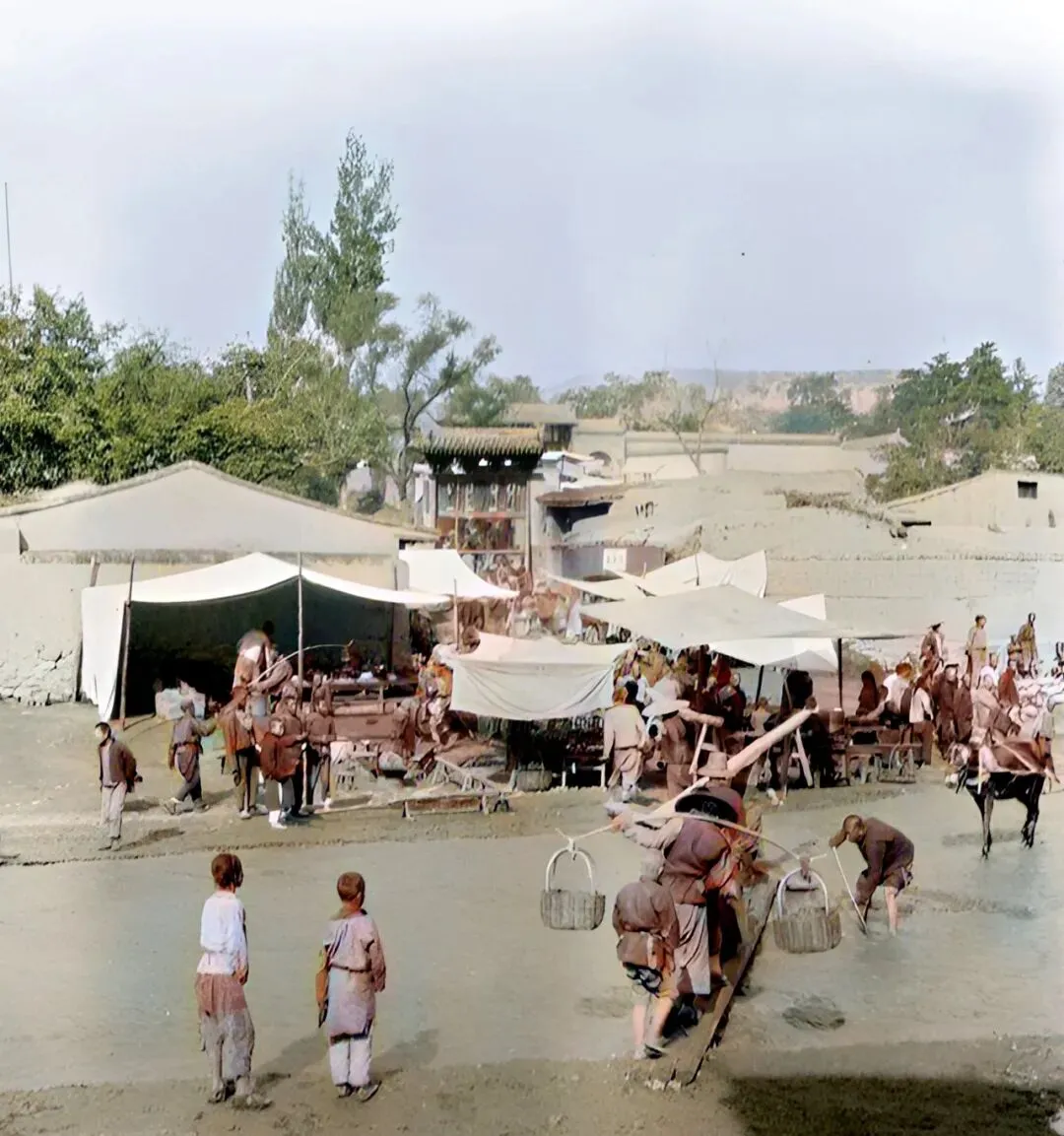 这片城门外的集市,白棚子一字排开,卖杂货的敲铜盆,卖饼子的翻铁铲,泥地上被踩出一条亮带,远处的门楼像守着一锅沸腾的人气,那时候集就是朋友圈,啥消息都在这儿碰见。