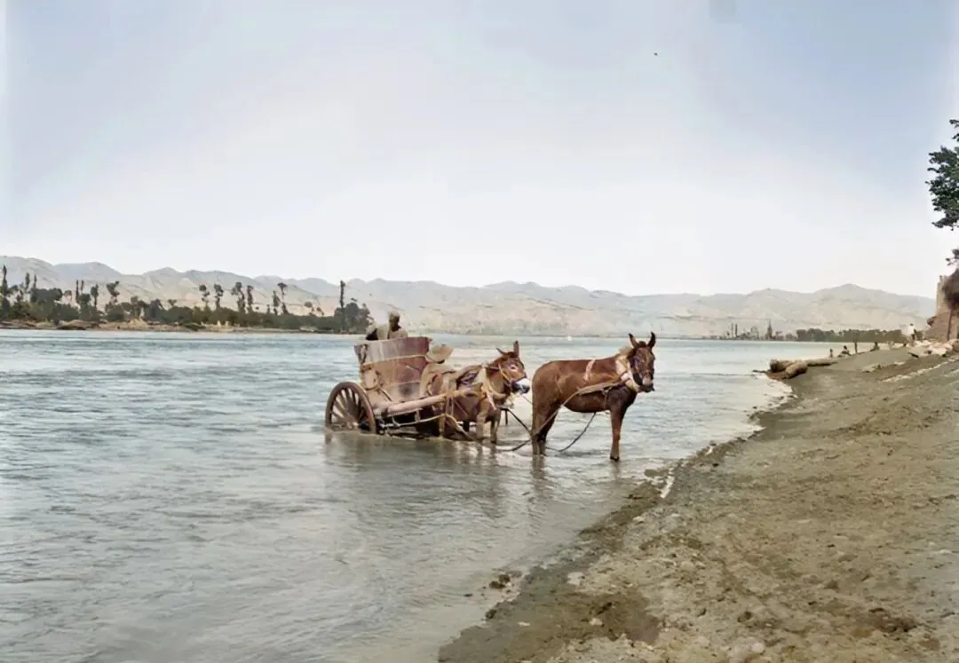 这辆拉水的马车直接扎进浅滩,桶大得能装半缸,车夫卷起裤腿,一把抓住辘轳边,水一压一提,桶壁咚咚敲在车板上,太阳照得河面白花花的,回城一晃就是一条街的生意。