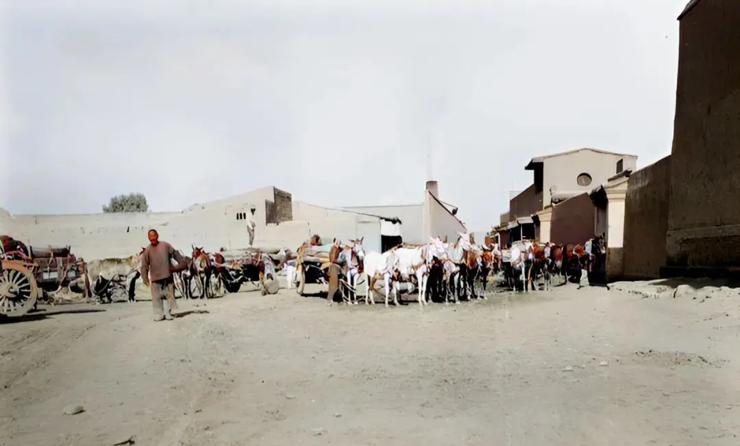 这拨拉货的车队在小镇上歇脚,骡马一溜儿站齐,车辙在地上刻出密密的沟,赶车的卸下水袋,顺手拍一把马脖颈,嘴里嘟囔两句,快点儿吃,太阳下了再走,夜路凉快。