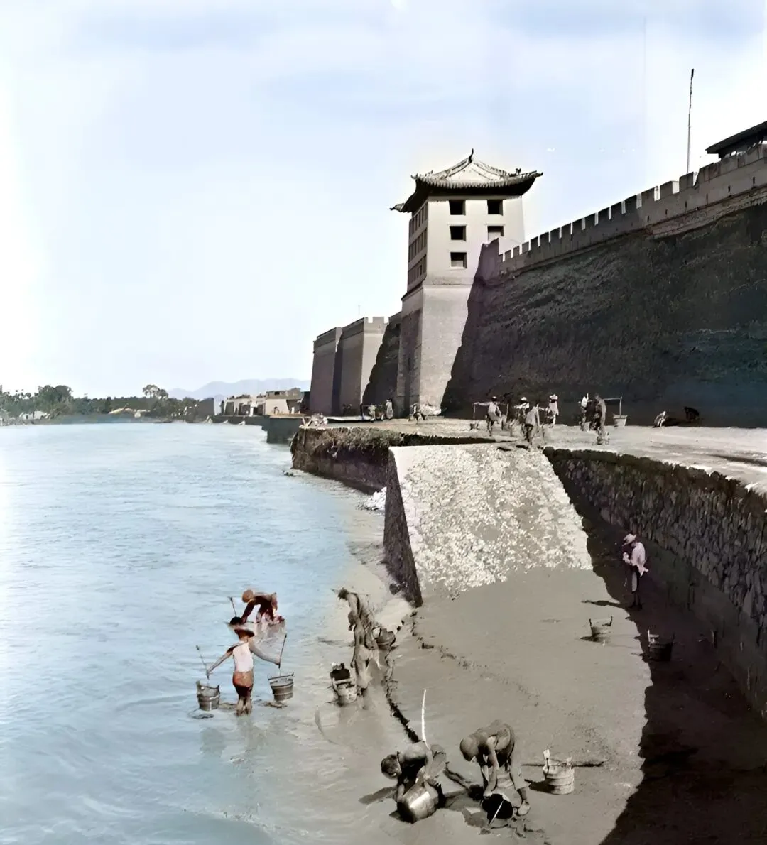 这道斜坡抹得平平整整,正好给挑水人顺着走,泥面上翻着湿光,城墙的阴影沿着脚边拖得老长,边上有人在淘泥巴补坯,女人把桶口的草绳又勒紧一圈,说别掉了,这一趟打回去还要煮面呢。