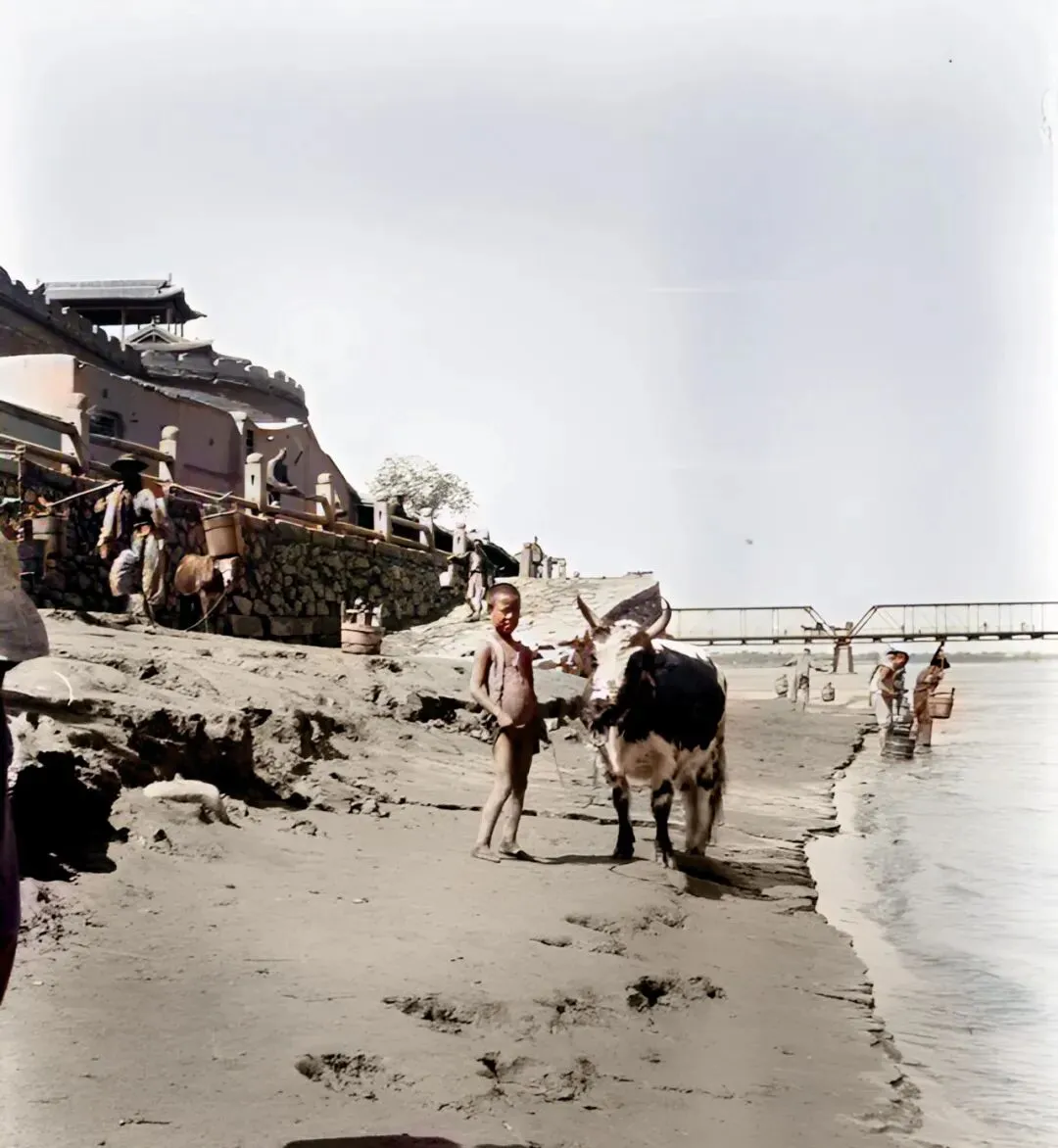 河滩上小男孩牵着一头牛,牛嘴探进水里,鼻子打着响泡,远处横着那道铁梁桥,就是后来叫中山桥的那座,彼时还是老名老样,桥墩稳稳站水中,过桥要排队,车行人行各走各的道。