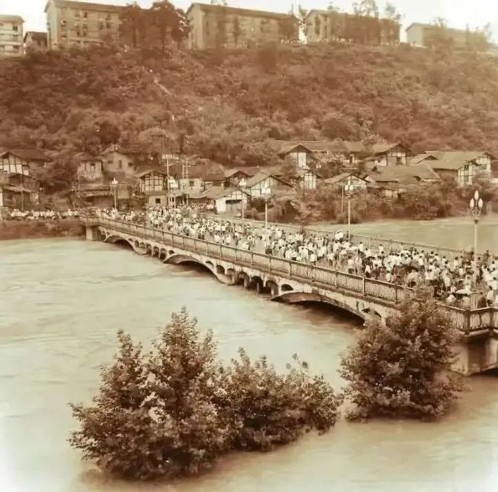 自贡十字口大桥,暴雨过后,水位涨到了桥面底,桥上人很多,大概都是来看洪水的。桥的对面有一排低矮的瓦房,瓦房后是斜坡,坡上种了密密麻麻的树,坡上面高处,有好几幢好几层高的瓦房。