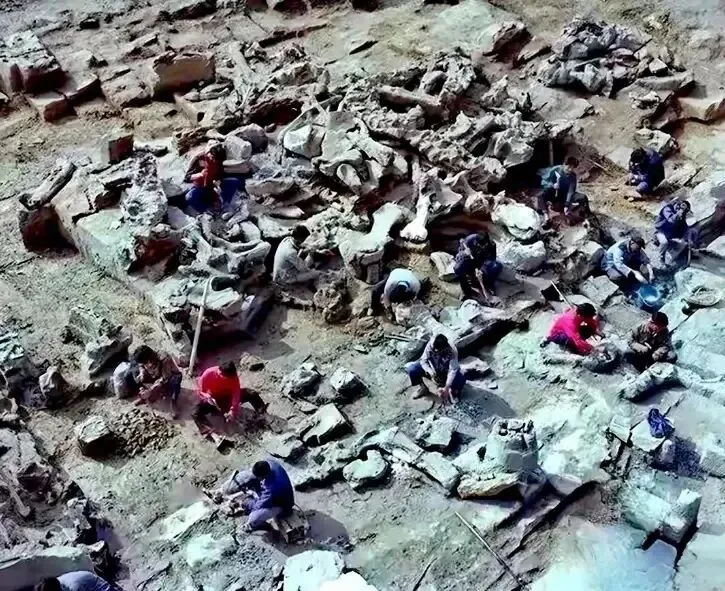 自贡恐龙博物馆发掘现场,十几位考古学家正努力埋头小心翼翼的挖掘化石。