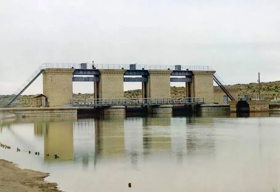 这个三孔闸门叫小水坝,砖面规整,金属栏杆细细长长,坝前水面像被熨过,平得很,旁边站人看水,手扶帽檐,风一来衣角飘起来一点。