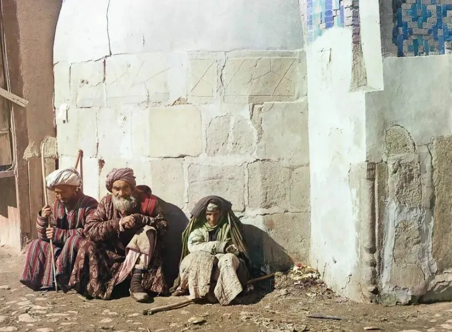 墙根这仨人裹着条纹长袍坐着歇气,拐杖横在膝上,墙皮起碱掉渣,光影在脸上走来走去,最右边的小个子把手揣在袖子里,像在打量镜头。