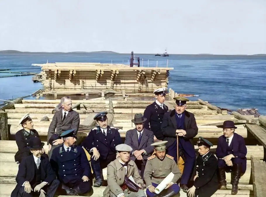 这张是码头工务的合影,制服扣得紧紧的,图纸卷在膝上,背后木排摞得高高的,海水蓝得发亮,像新打的搪瓷盆。
