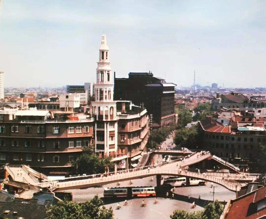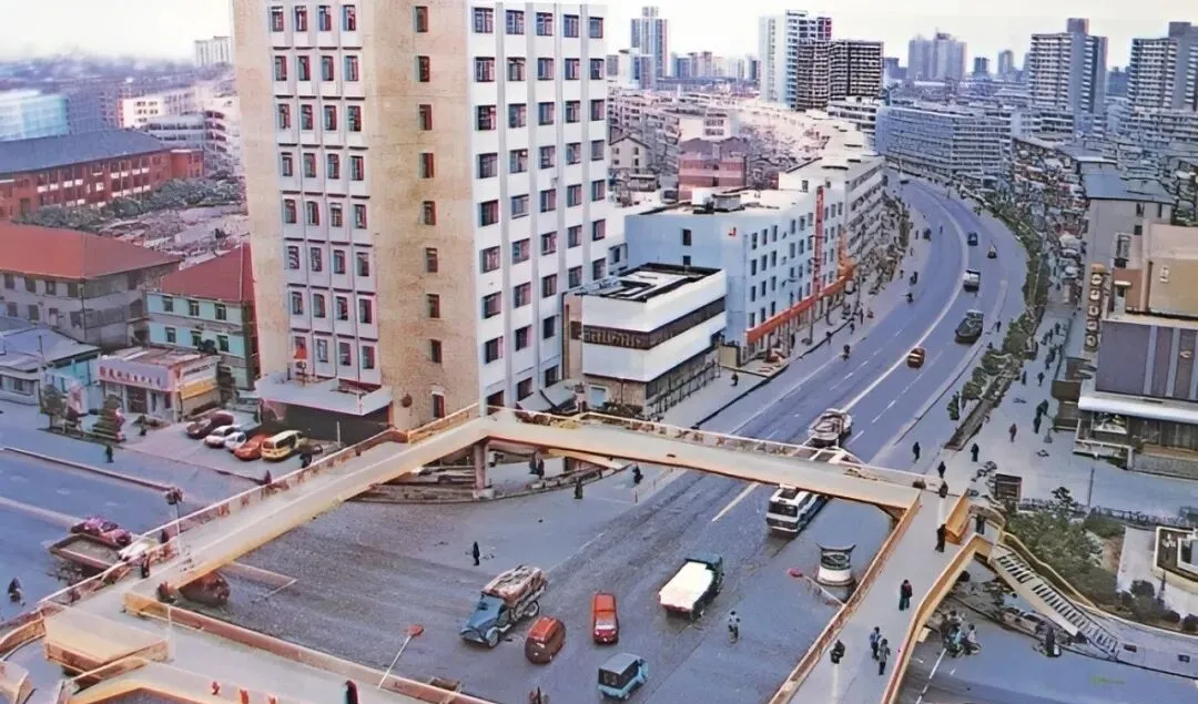 这个从空中看像高脚杯的家伙就是那时最潮的人行天桥,桥面转来转去把几幢楼牵在一块儿,站在桥心看车流,像把整座城市端在手心里,现在高架一条接一条,这种精巧的步行桥倒是不多见了。