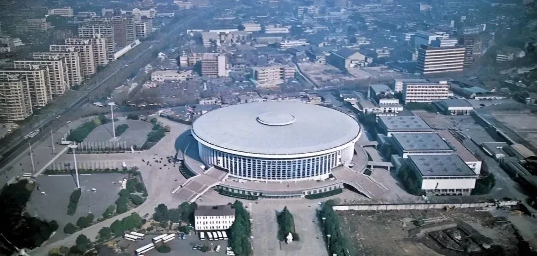 这座大圆碟子就是万体馆,白色屋面一铺,四周是细细的竖窗,队伍在广场上排开,像练书法一样整齐,馆里能坐一万八千人,我第一次进这种场馆还是学生票,抬头一看头顶像天盖着,心口怦怦跳。