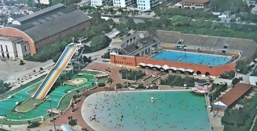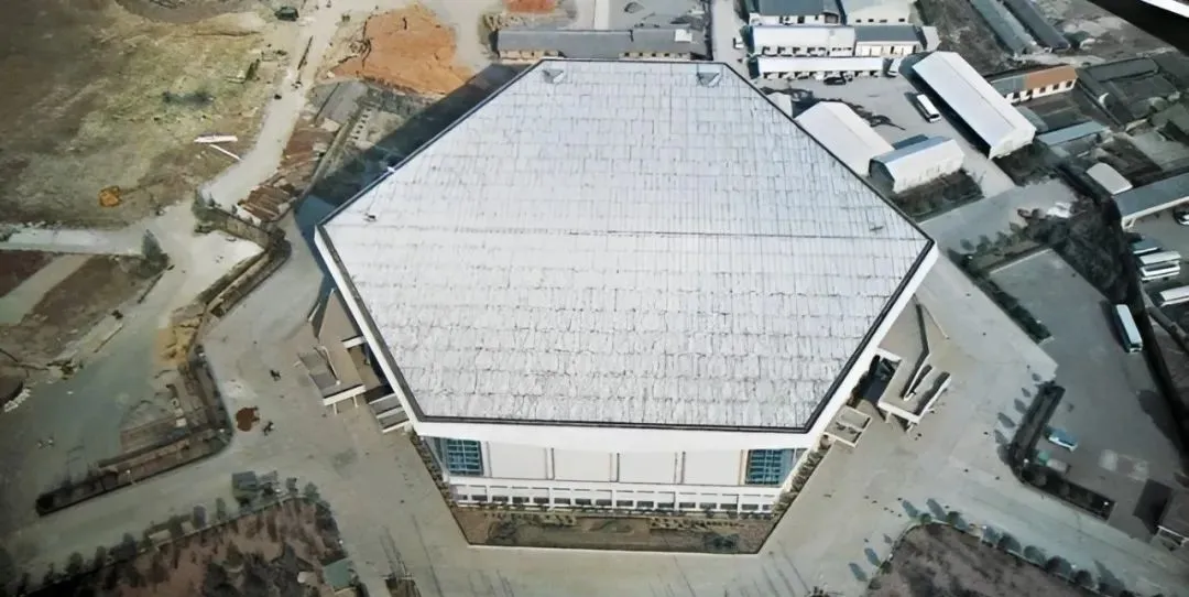 这个不等边六边形的方头方脑,就是上海游泳馆,屋顶像块巨大的白巧克力板,边上水泥路空空的,只有几辆卡车晃过,爸爸说当年全运会的跳水就在这儿,水一翻,座位上就“哗”地炸开。