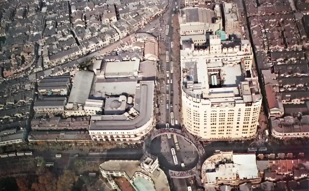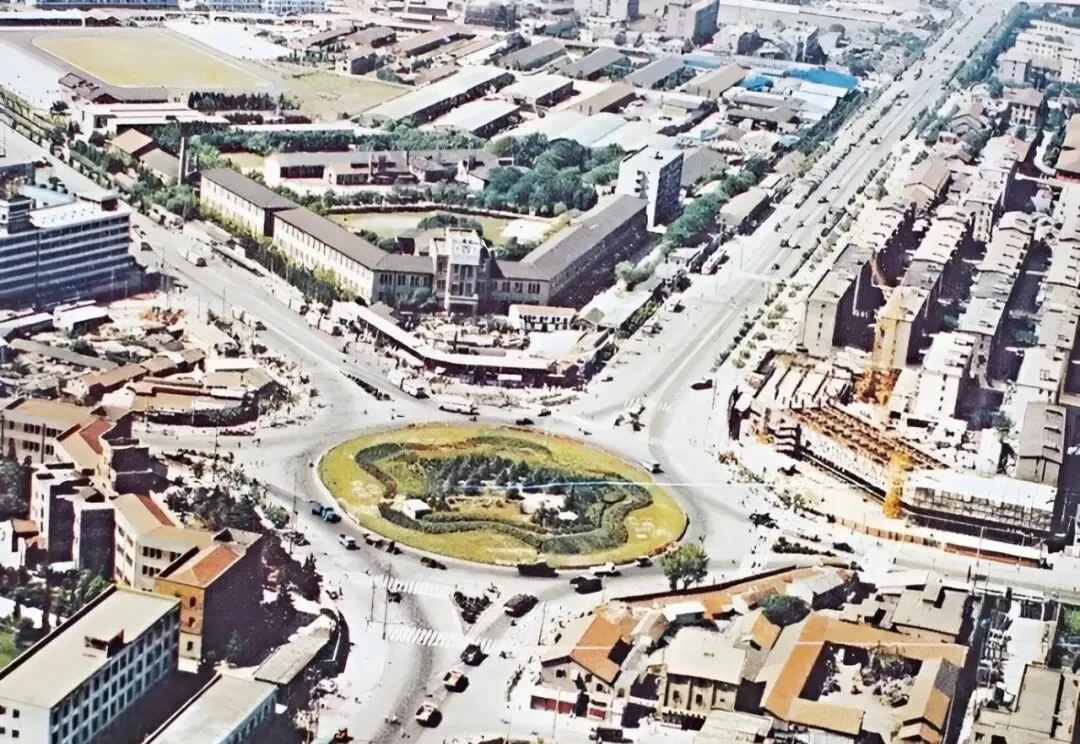 这个大大的椭圆转盘是徐家汇的门面,当年中间种满了树,边上人行道宽得很,电车一圈一圈绕,妈妈说那时候逛太平洋百货得先在这儿找路口,不然就被车流晃糊了眼。