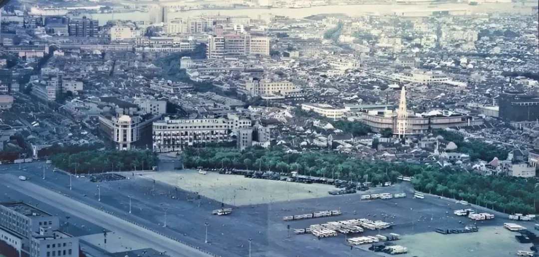 这个大空地是那会儿的人民广场,停车的公共汽车一溜排着,前身是跑马厅,四周的绿树把边框扣紧,后来高楼一圈圈长出来,这里就成了城市的会客厅。