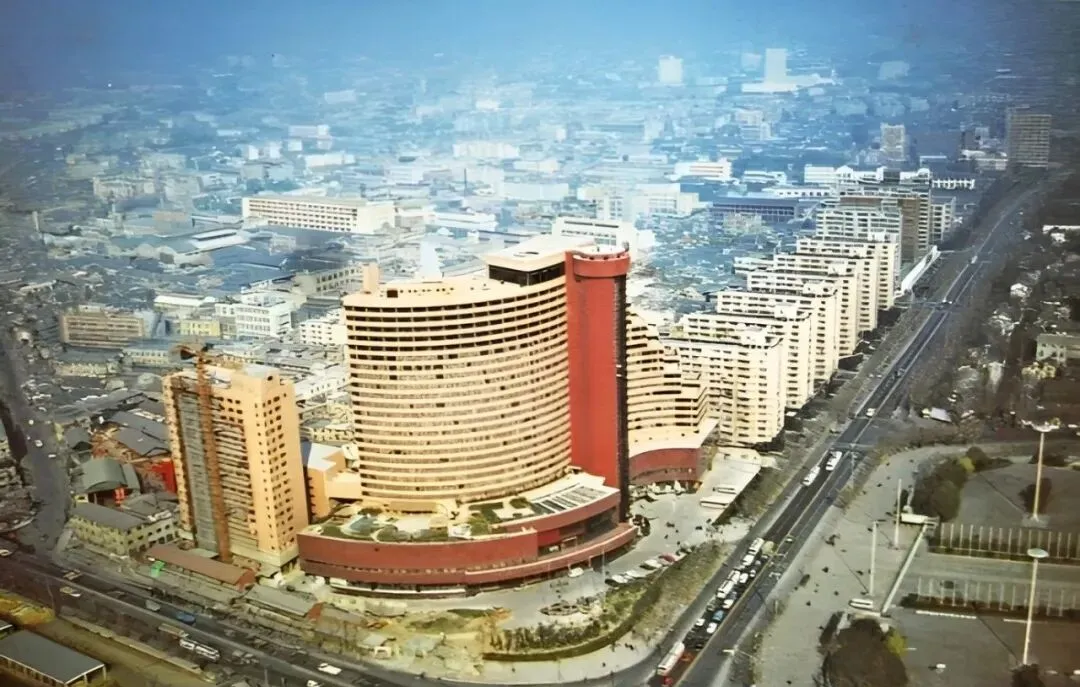 这个红色的大弧面是华亭宾馆,一排住宅像波浪一样排开,曲线在那会儿可新鲜了,站在底下抬头看,忍不住“哇”一声,设计师真会写字,用楼写的。