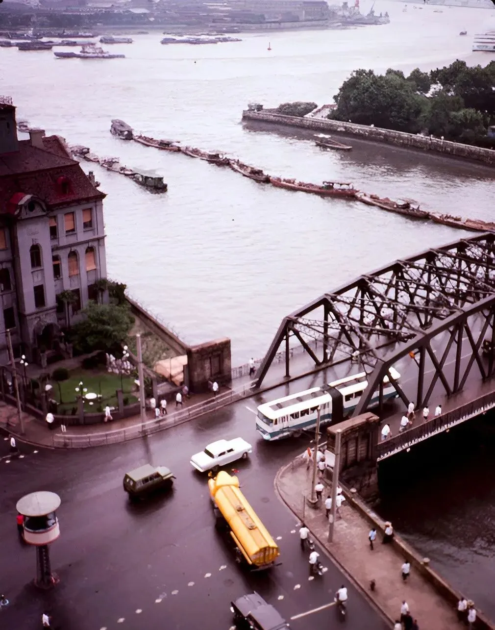 这边的铁桥就是外白渡桥,雨后一地亮晶晶,黄浦江里拖着一串木船,像系了一根线,车拐进桥洞前都要缓一缓,谁都不急,桥身咔嗒咔嗒,听着心里稳当。